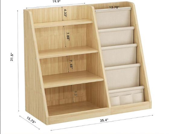 - PERFECT SIZE & PREMIUM QUALITY: The overall dimension of the wooden kids bookcase is 15.7"D x 35.4"W x 31.5"H, a perfect size book shelf for kids to store books; Made of premium pine wood and thicked canvas for durable and long-lasting.