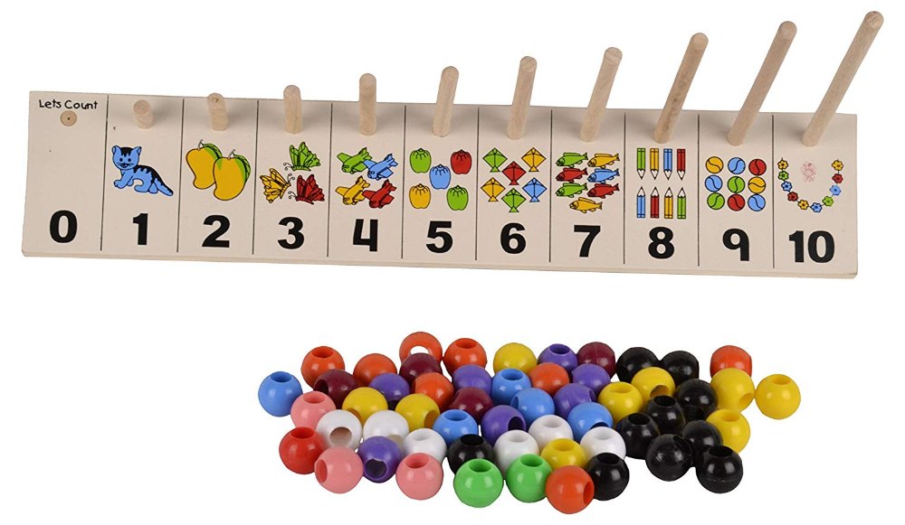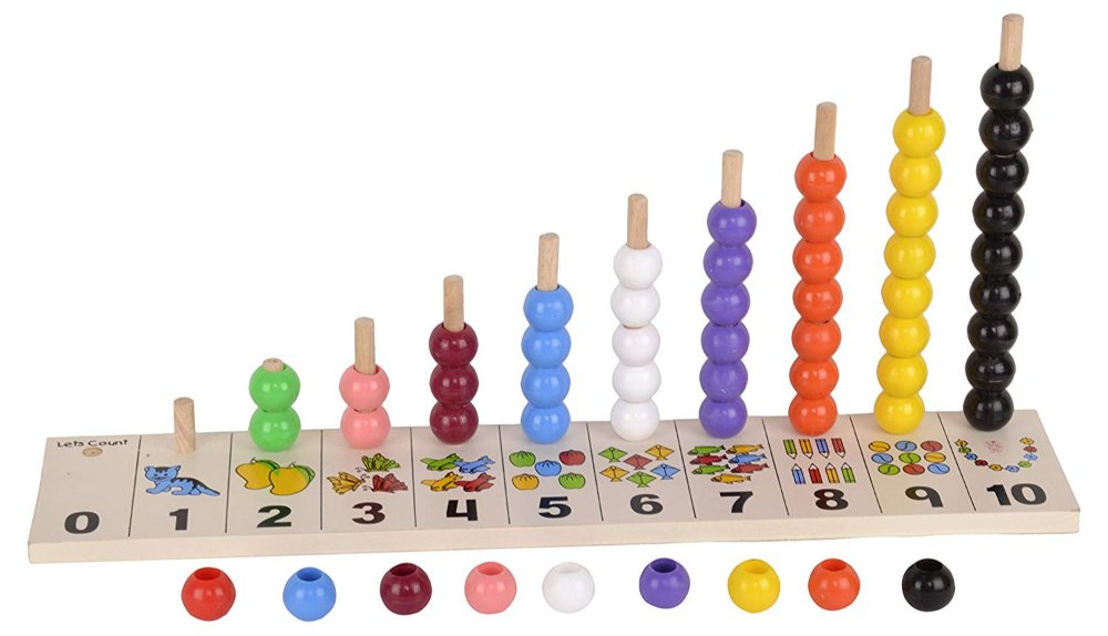 - A dowels of different sizes have colorful beads ranging from 1 to 10