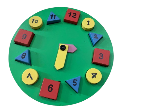 This clock is a great way to help children learn time-telling skills. The colourful clock has numbers installed into different shapes and it helps kids learn numbers, colours, shapes and time-- all at once-- while playing with the clock! Construction : Wooden shape Teaches time, shapes, numbers and colours
